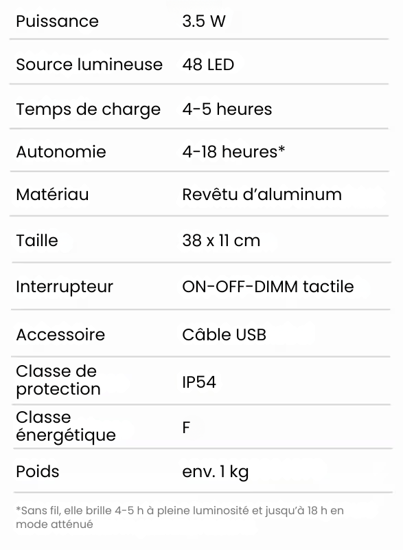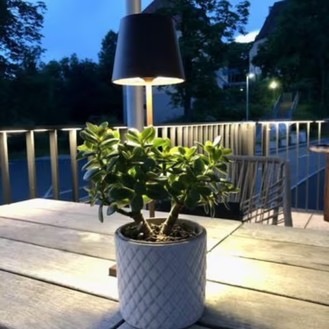 Le poids élevé de la lampe (environ 1 kg), combiné à sa base stable et à son centre de gravité bas, l'empêche de glisser ou de se renverser, ce qui la rend parfaite pour les balcons ou les terrasses.